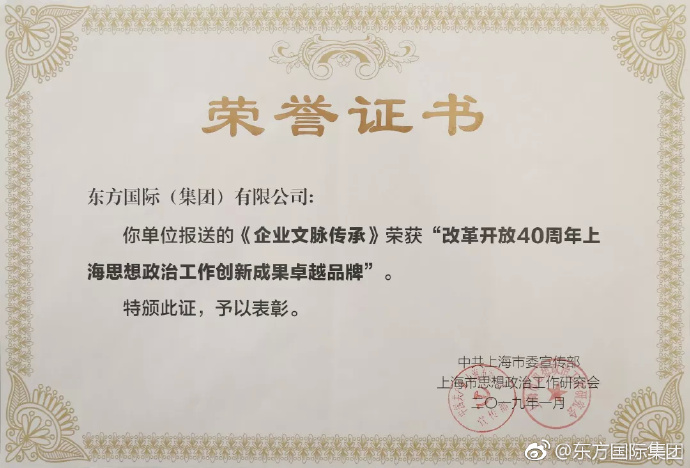 1月14日,由上海市委宣傳部和上海市思想政治工作研究會共同召開上海思想政治工作創(chuàng)新成果微視頻(微電影)展示交流。東方國際集團(tuán)報(bào)送《企業(yè)文脈傳承》榮獲“改革開放40周年上海思想政治工作創(chuàng)新成果卓越品牌”。